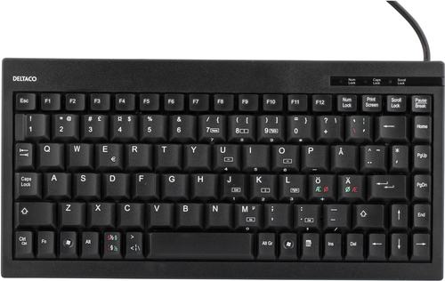 Deltaco Kvalitetsminitastatur, 89 taster, nordisk layout, USB, sort. Tastatur formfaktor: Mini. Tastatur stil: Lige. Forbindelsesteknologi: Ledningsført, Enhedsgrænseflade: USB, Tastatur nøglekontakt: Membran, Antal taster på tastatur: 89, Anbefalet brug: Universel. Produktfarve: Sort